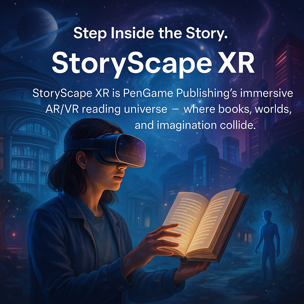 StoryScape XR is PenGame Publishing’s immersive AR/VR reading universe — where books, worlds, and imagination collide. Explore interactive libraries, cinematic story environments, and animated characters that respond to your touch and voice. Whether you’re in a galaxy far away, a neon-lit city, or an enchanted forest, StoryScape XR transforms every page into a living world you can walk through, listen to, and explore.